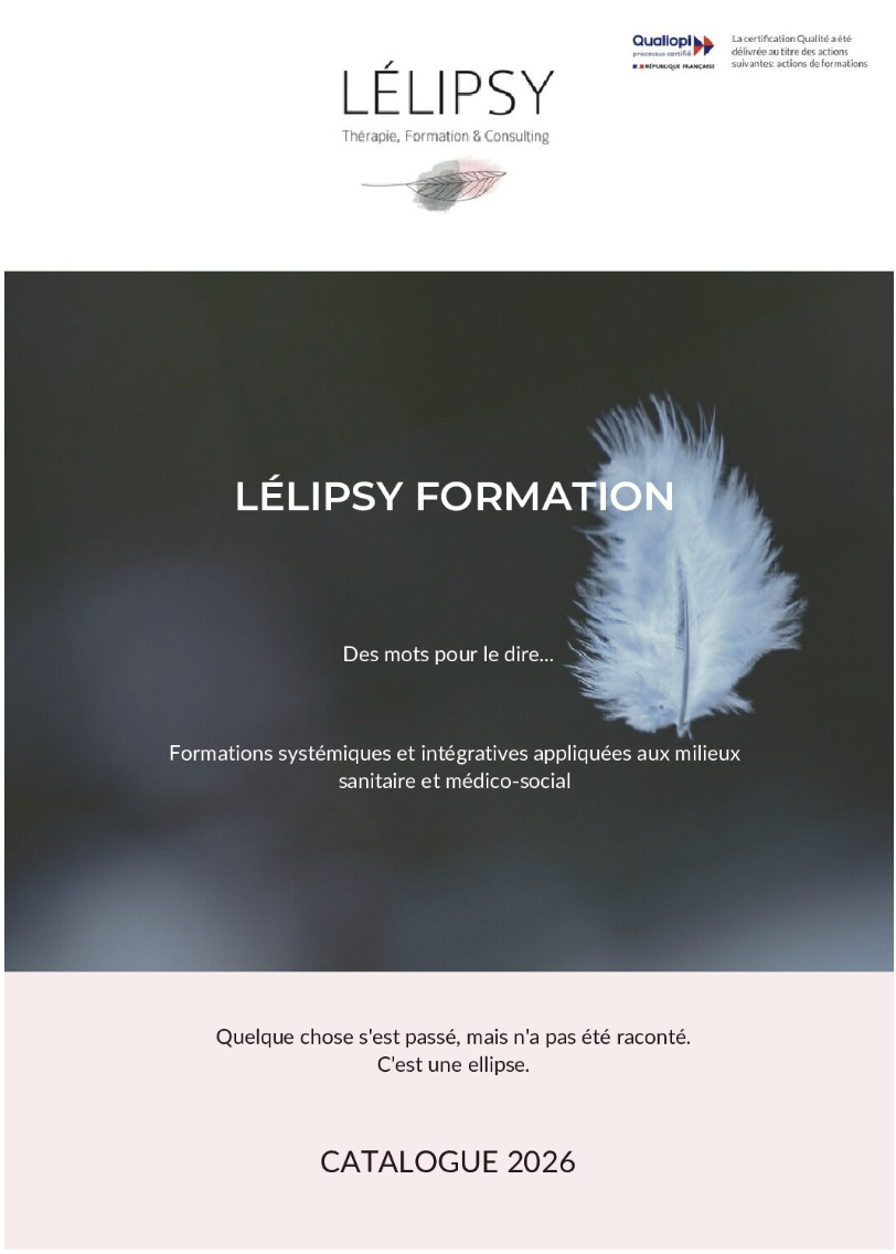 Le catalogue Lélipsy présente toutes les formations selon un classement par titre en abordant la problématique centrale et les points principaux développés. Il présente également le calendrier des formations dans les locaux parisiens et lyonnais ainsi que l’analyse des pratiques professionnelles.